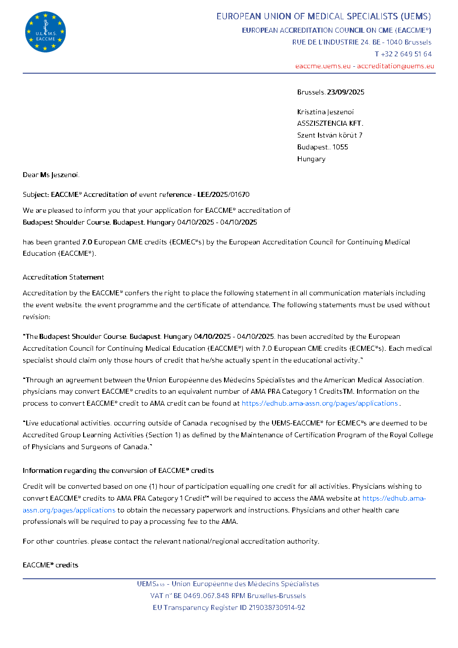 The Budapest Shoulder Course, Budapest, Hungary 04/10/2025 - 04/10/2025, has been accredited by the European Accreditation Council for Continuing Medical Education (EACCME®) with 7.0 European CME credits (ECMEC®s). Each medical specialist should claim only those hours of credit that he/she actually spent in the educational activity.